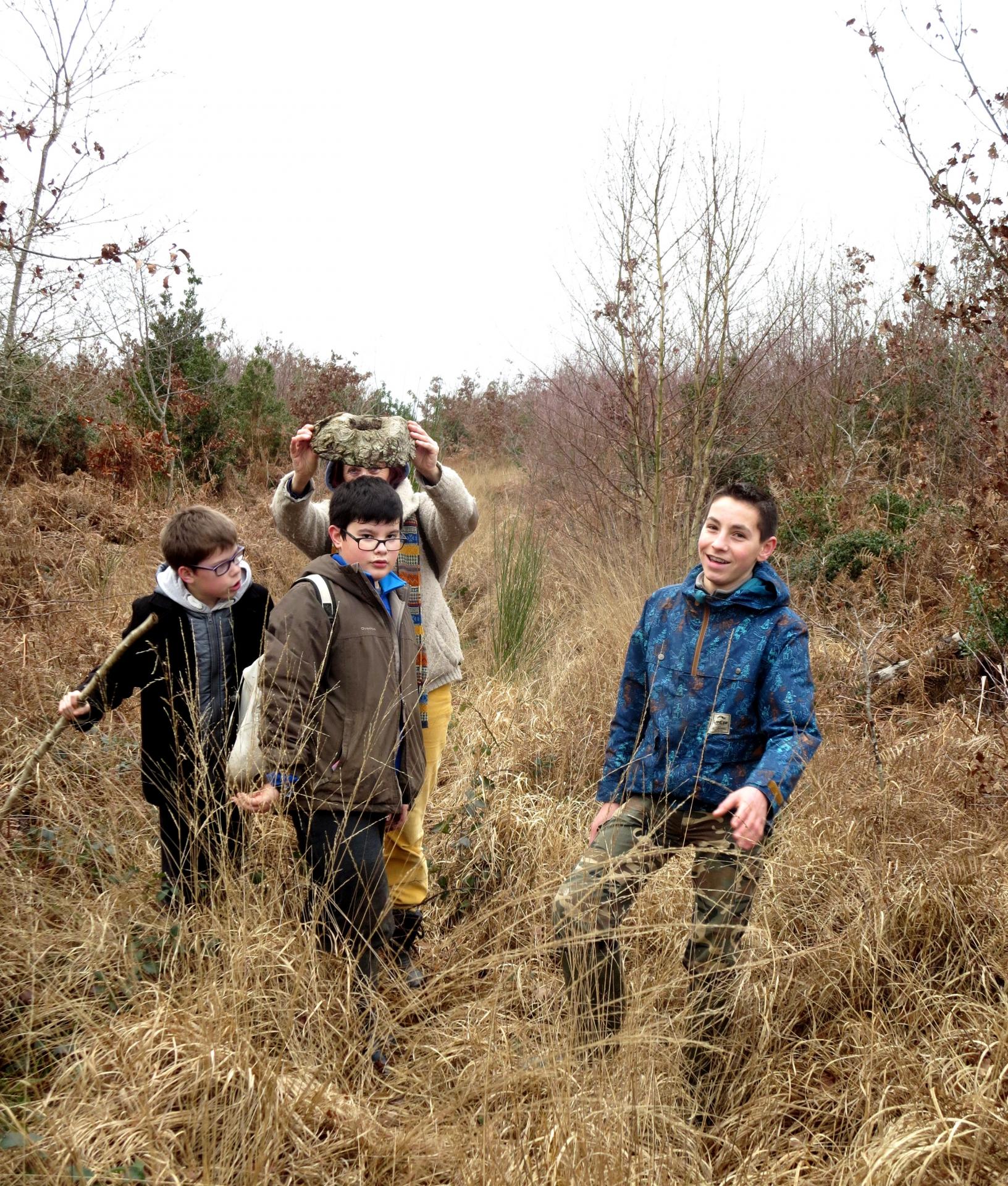 Trois jours plus tard, j’attends la classe « forêt » du collège St Laurent entre un mur de troncs de pins et des déchets abandonnés à l’entrée de l’allée de la Mouthe. L’aventure commence par une course d’orientation sans grande difficultés qui s’achève par une séance de selfies. Il faut dire que ces jeunes du XXIème siècle sont archi connectés. Tous sont porteurs d’une tablette avec GPS le plus souvent complétée d’un portable. Les boussoles classiques ont plutôt un statut de reliques… Pique-nique sur les hauteurs du site des thermes, sélection de morceaux de bois aux formes étranges pour le prochain cours d’arts plastiques, et nouvelle marche où l’on revit les aventures et découvertes du samedi précédent.